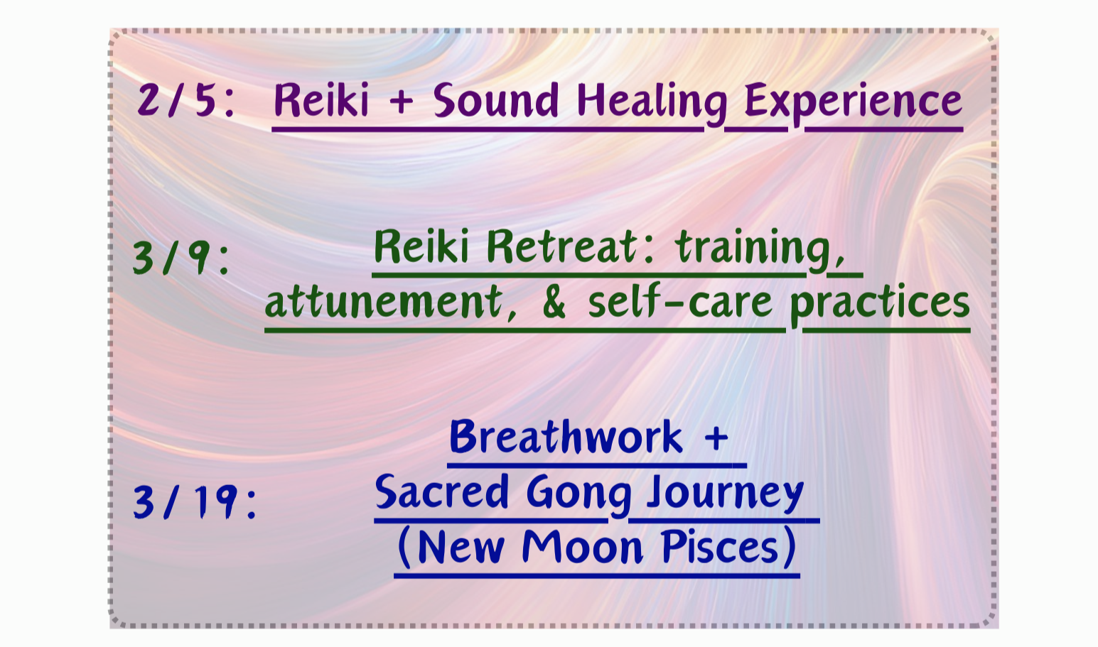 Services offered through Holistic Journey are intended to compliment your life and wellness. We do not diagnose or replace professional medical treatment or therapies. We strongly encourage personal discernment and following one’s personal belief system. Some offerings may not work for everyone. Openness to experience, where you’re at in your journey, what has or hasn’t worked in the past, and releasing any prior judgement of self or situation can be beneficial in clearing limitations around your healing.